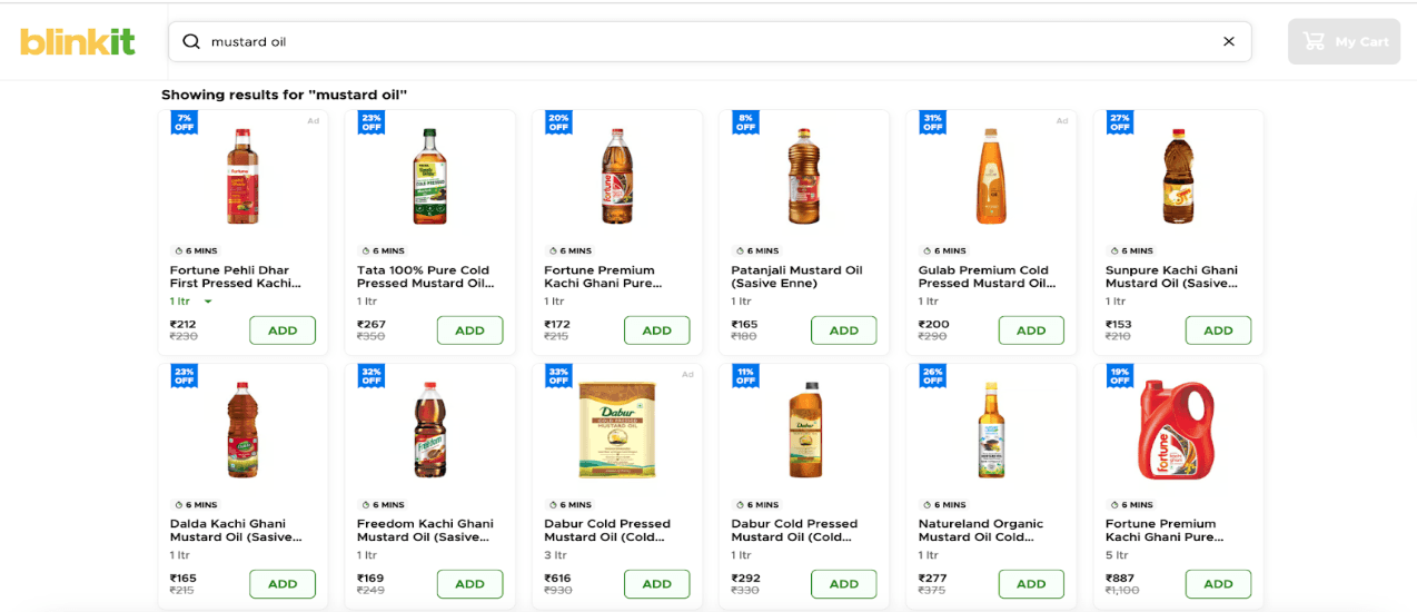 A real-world example: search “mustard oil” on Blinkit. You’ll see brands like Fortune or Dabur show up in both sponsored placements and organic rankings — essentially bidding against themselves.They’re paying for clicks they may have earned for free.