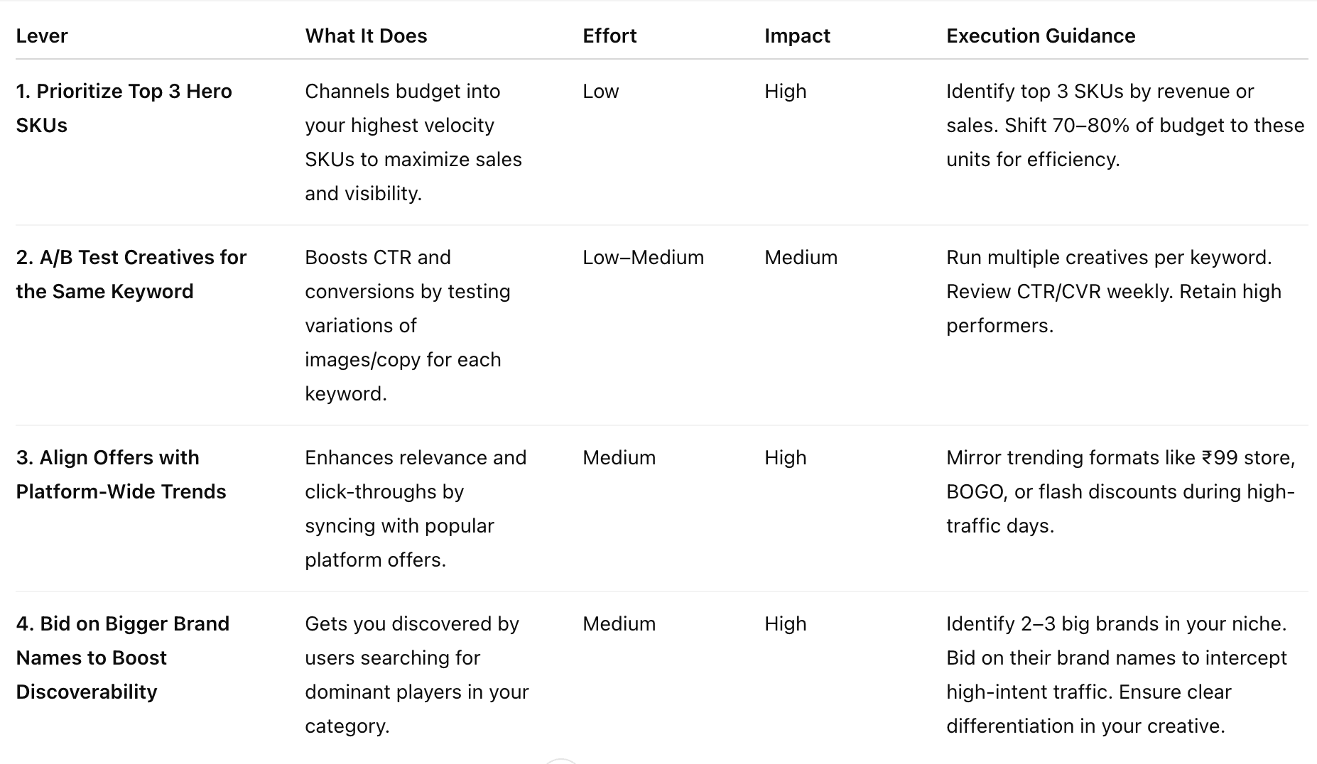 Rather than focusing on broad category coverage, brands assign each SKU a velocity index (units sold per day per store). This allows them to focus on hero SKUs that disproportionately influence revenue contribution and platform visibility algorithms, avoiding dilution of operational efforts across low-performing SKUs.