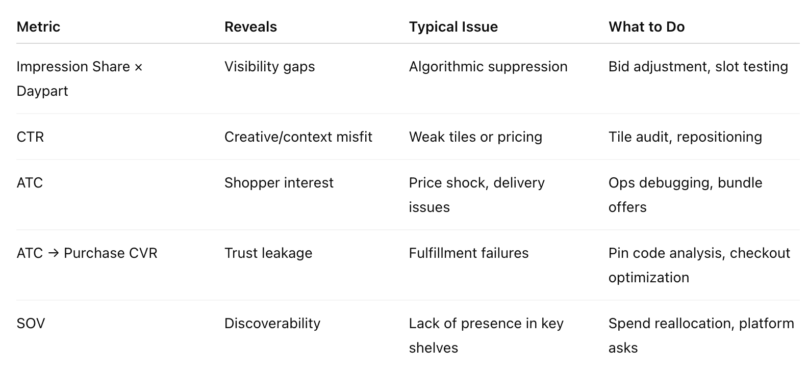 To grow sustainably, you need to widen the aperture. ROAS alone can’t tell you where you’re missing out. That’s where diagnostic metrics — impression share by daypart, CTR, add-to-cart rate, and category-level share of voice — come in. Because on algorithmic platforms like QCom, success isn’t just about performance. It’s about presence.